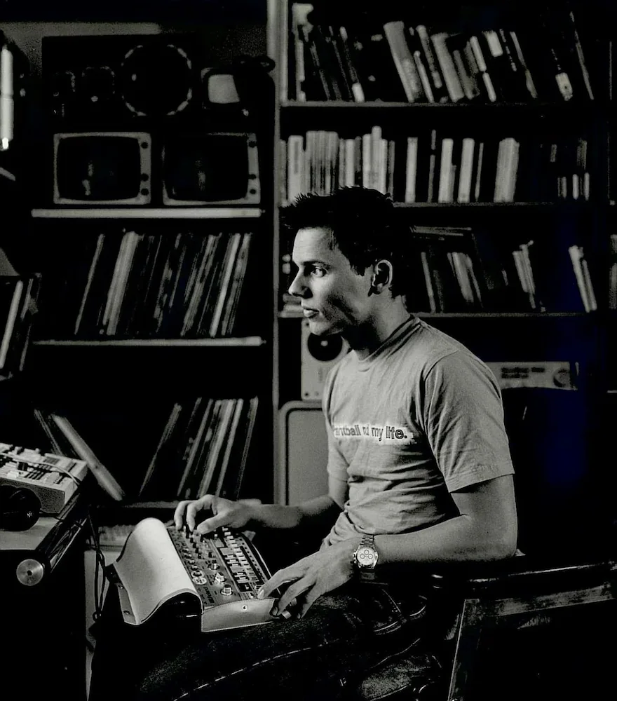 Уилл Шимура (Lyrics Born, тогда Asia Born) и Джошуа Дэвис (DJ Shadow) в студии. Девяностые. Шимура, кстати, это размытый чувак в белом свитере на обложке альбома Шэдоу Endtroducing